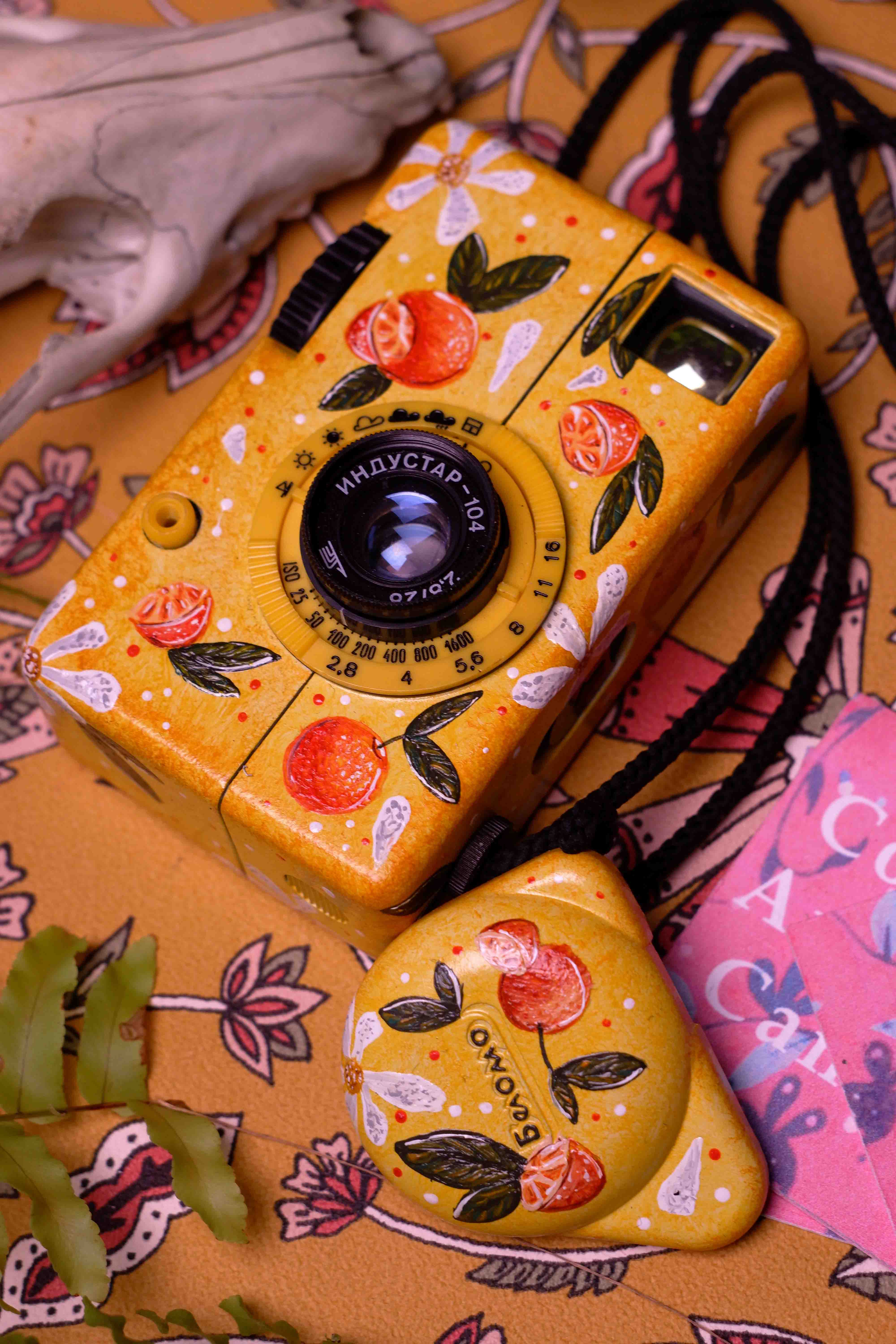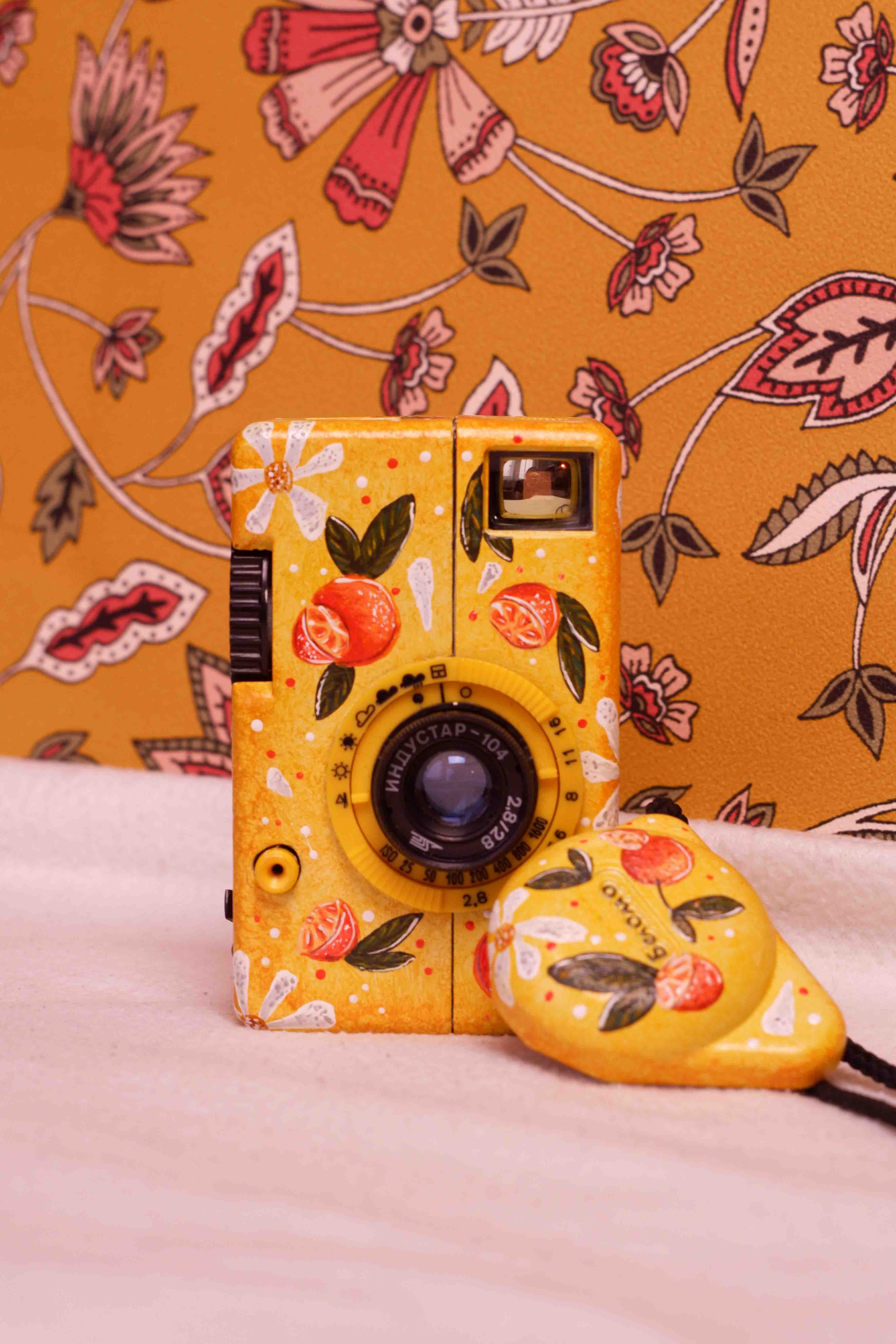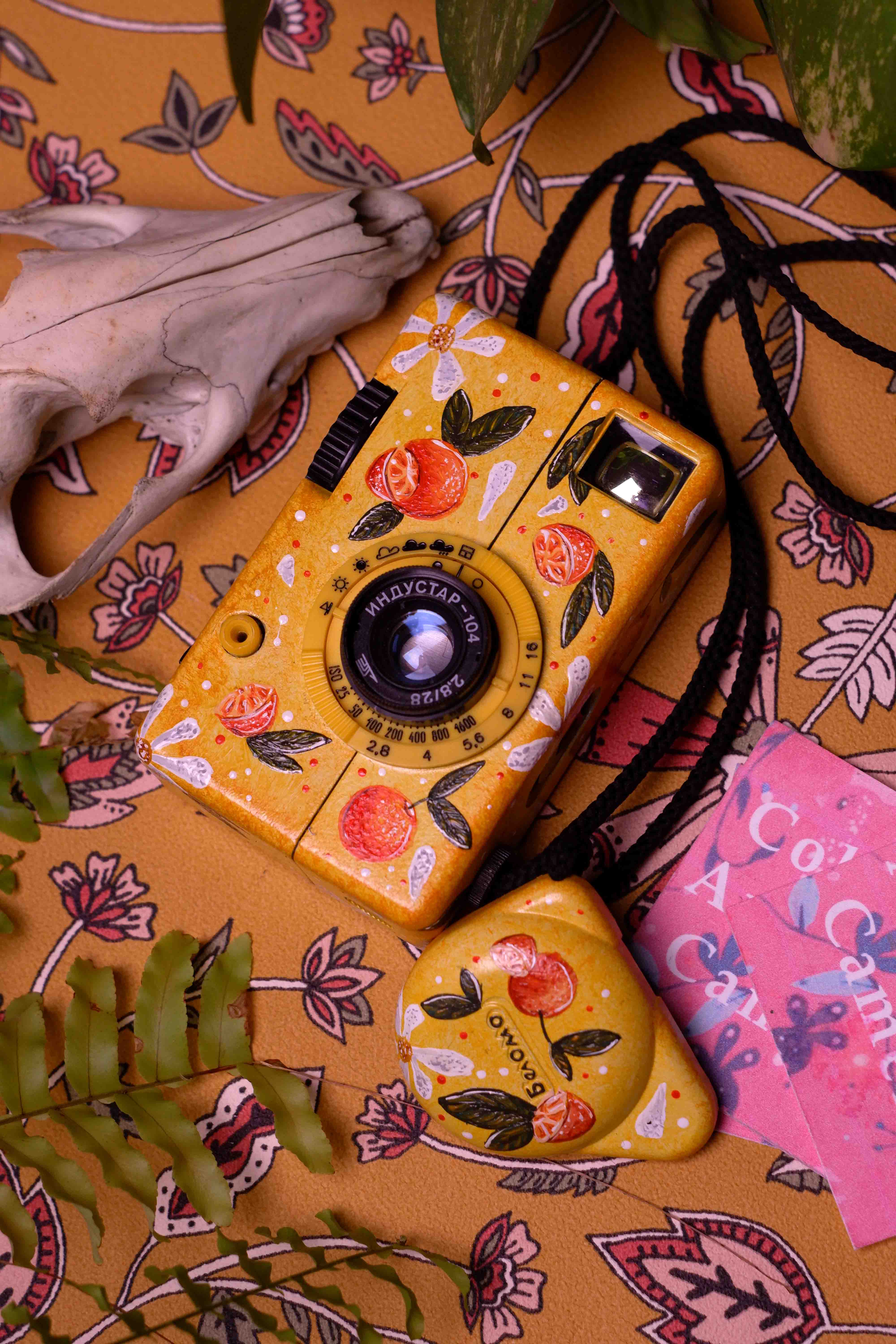 The Belomo Agat 18K is a compact Soviet half-frame 35mm film camera, known for its lightweight build and distinctive retro design. This particular piece has been given a unique, hand-painted finish in bright summer tones, inspired by the warmth of oranges and blooming flowers. The lively palette gives this small classic a fresh, uplifting character while keeping its timeless charm.
