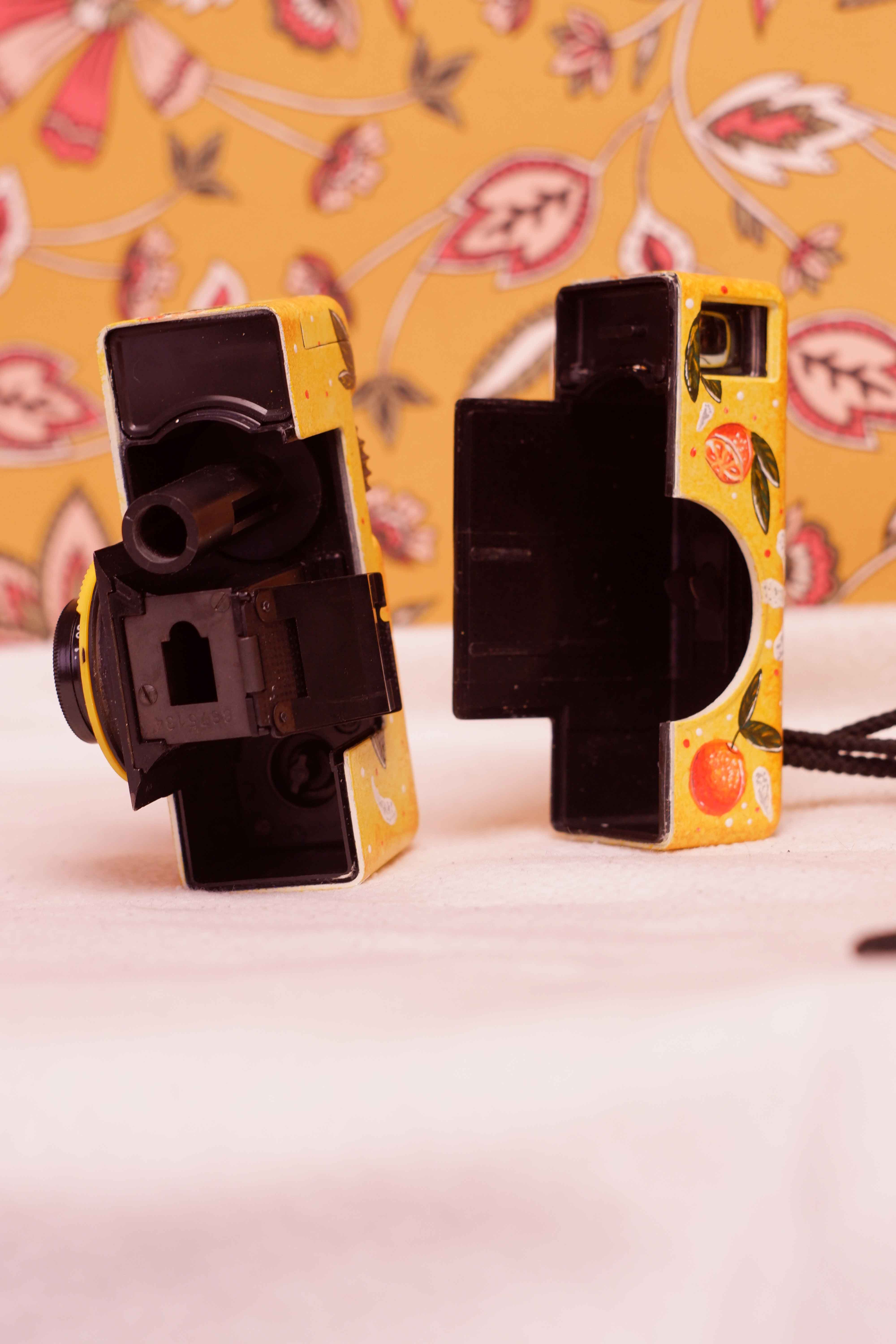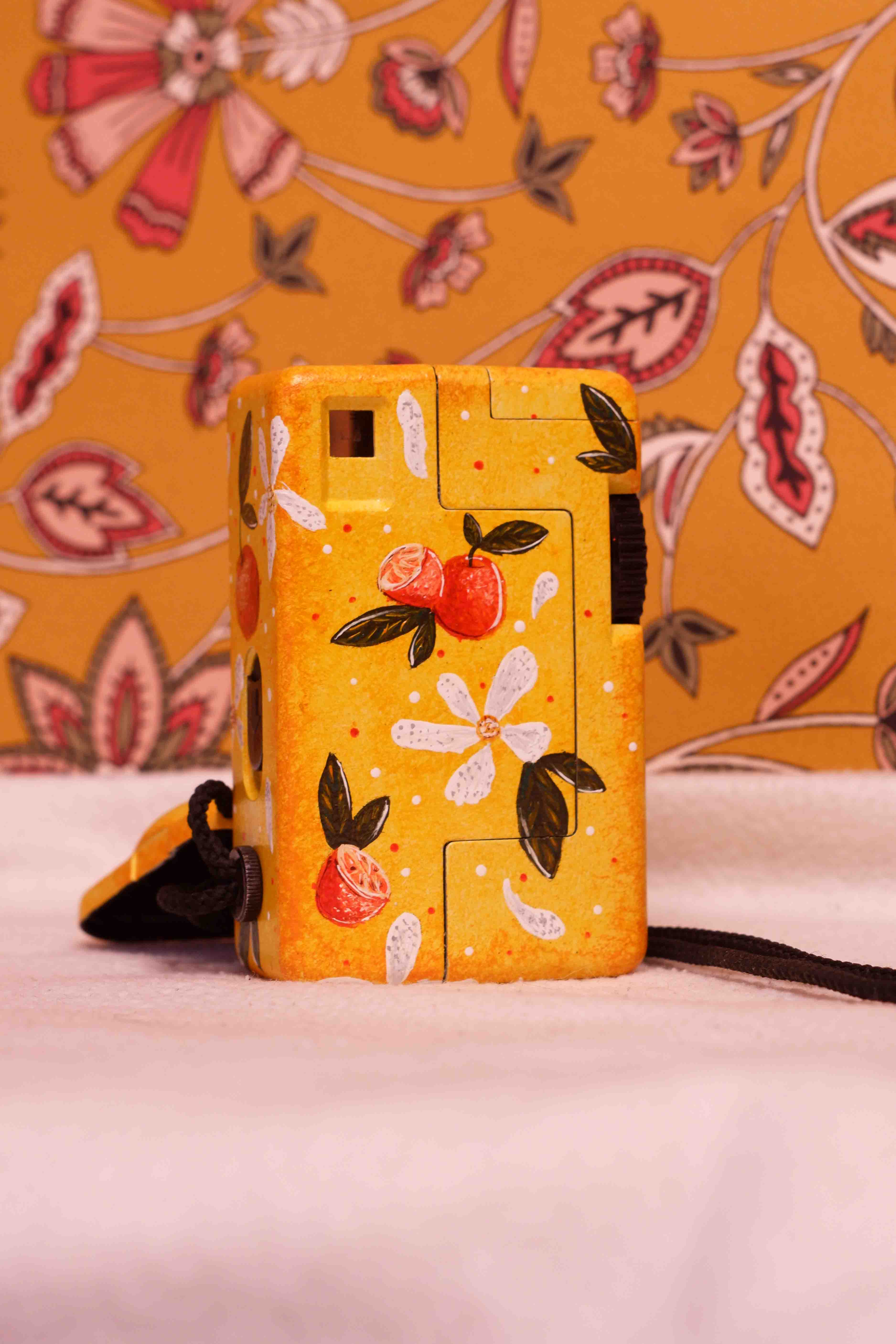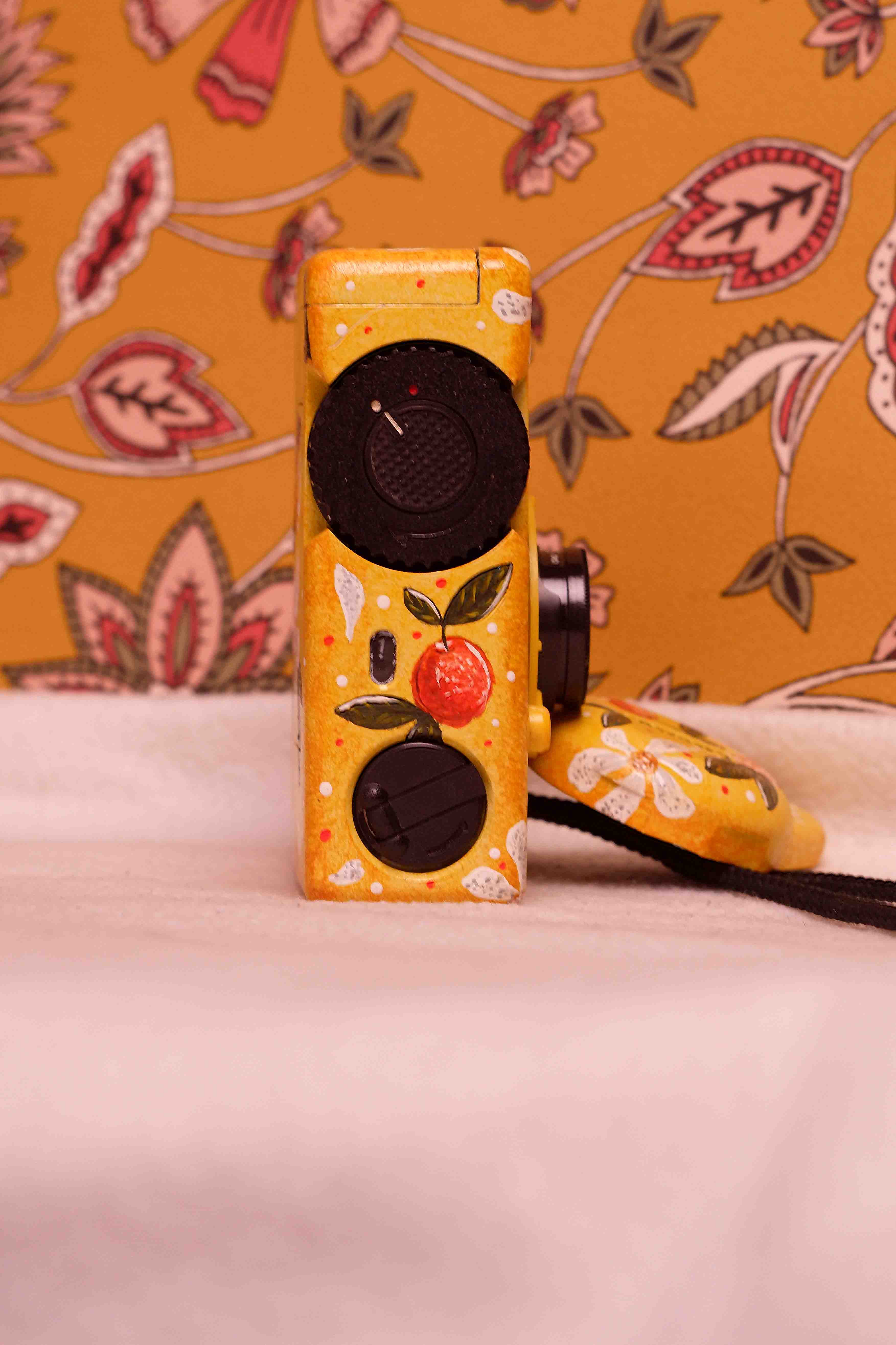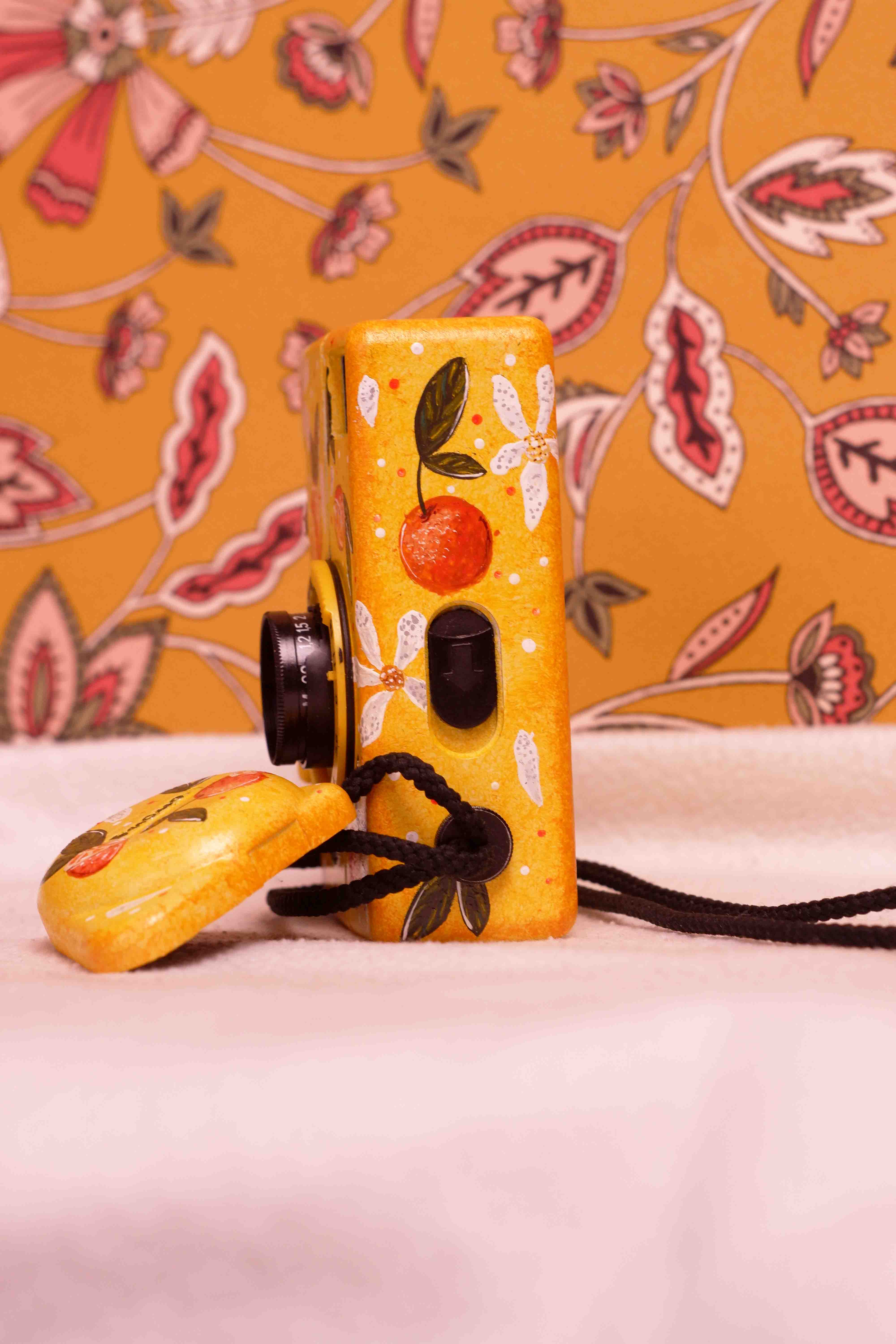The Belomo Agat 18K is a compact Soviet half-frame 35mm film camera, known for its lightweight build and distinctive retro design. This particular piece has been given a unique, hand-painted finish in bright summer tones, inspired by the warmth of oranges and blooming flowers. The lively palette gives this small classic a fresh, uplifting character while keeping its timeless charm.