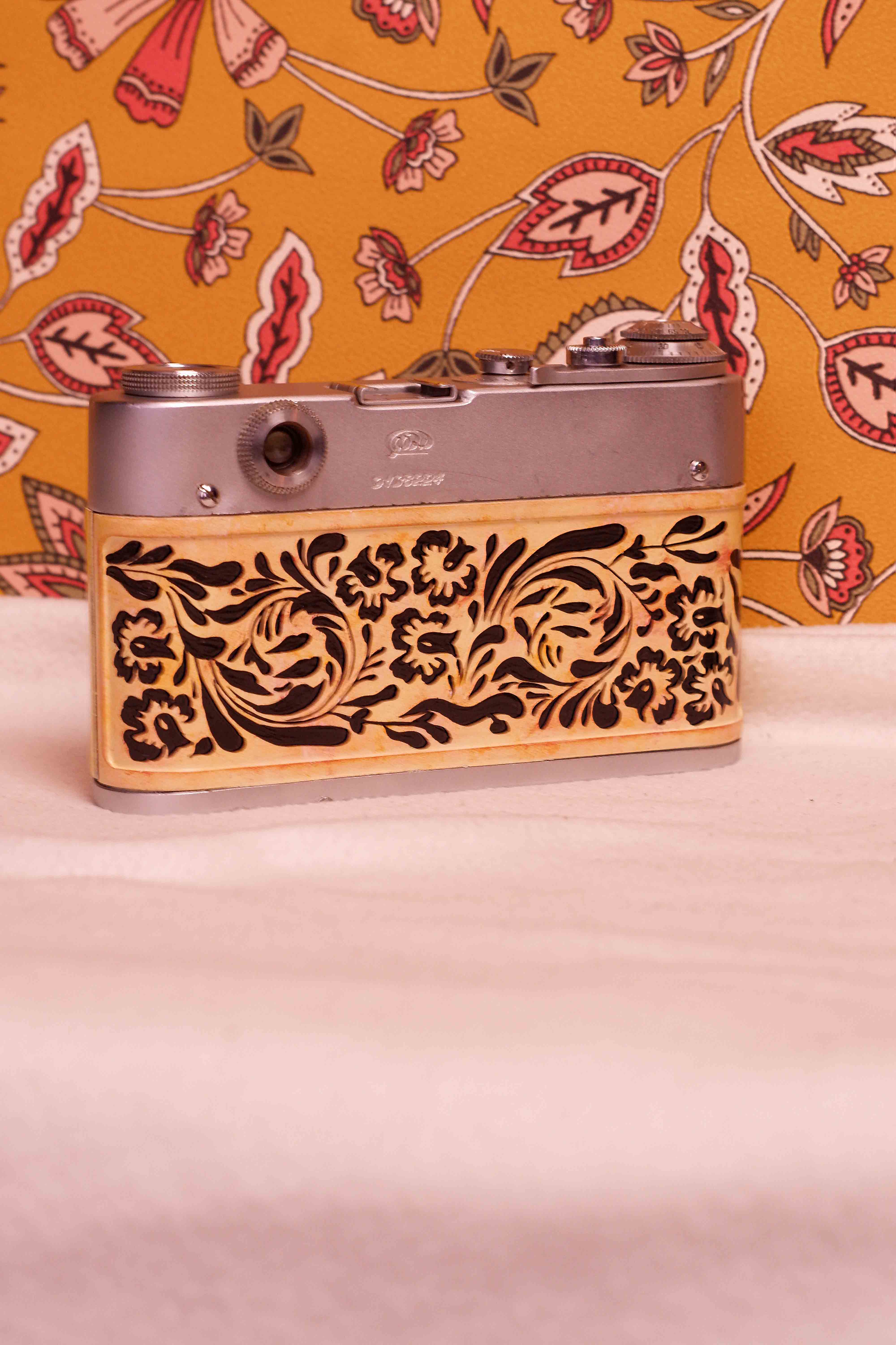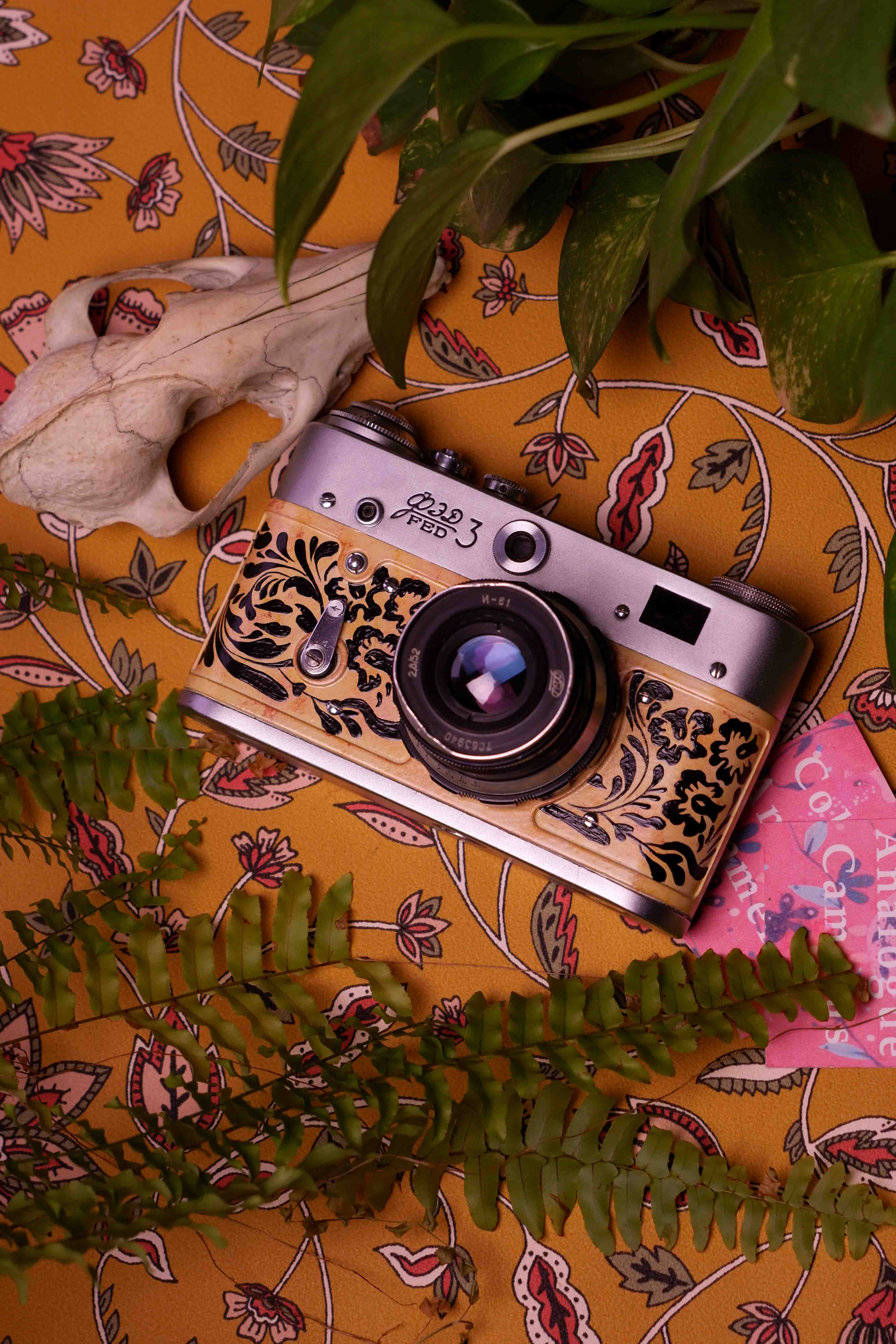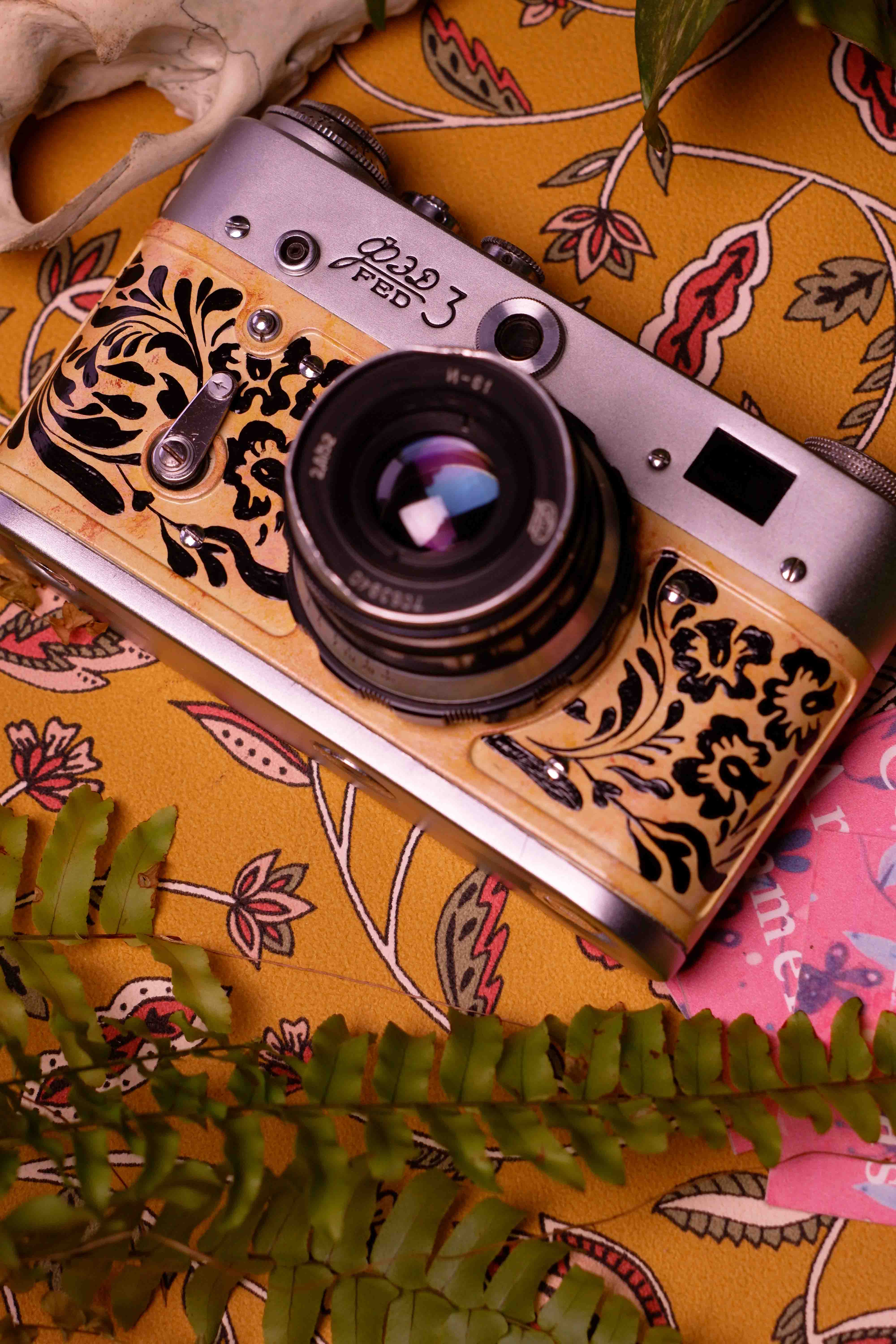 This FED 3 film camera combines classic Soviet engineering with a refined modern aesthetic. Painted in a warm beige tone and decorated with intricate black ornamental details, it transforms a functional vintage tool into an elegant collector’s piece.
