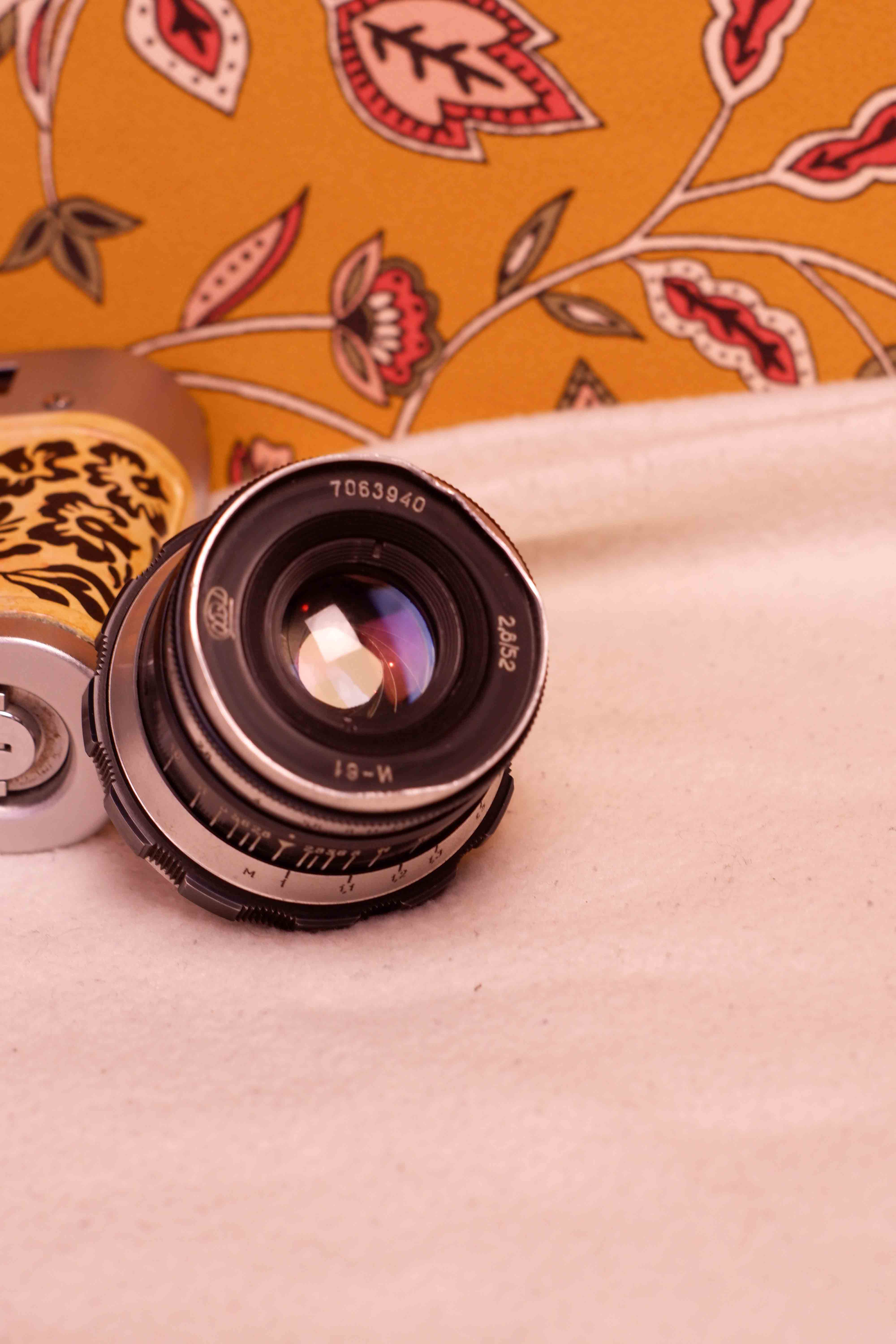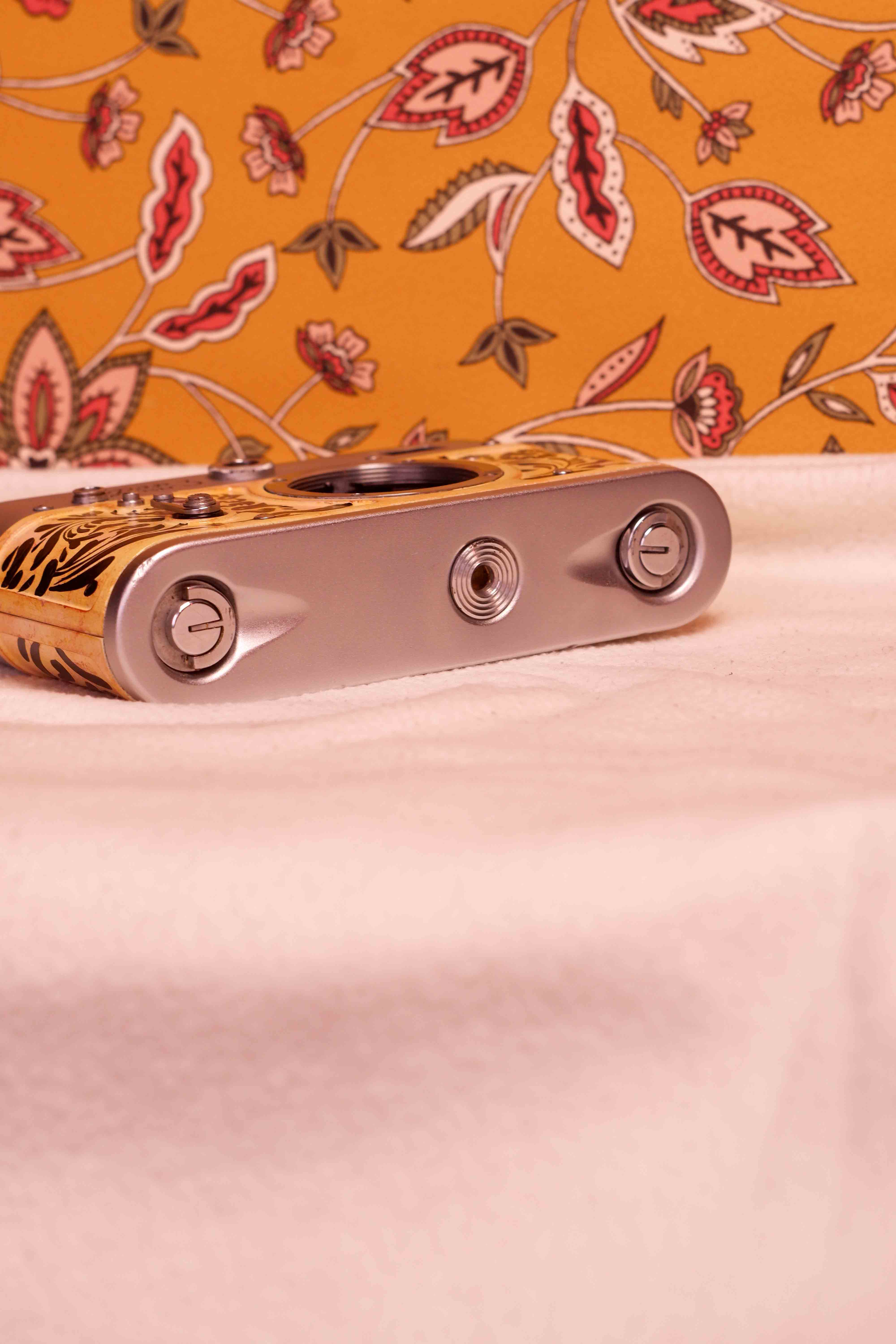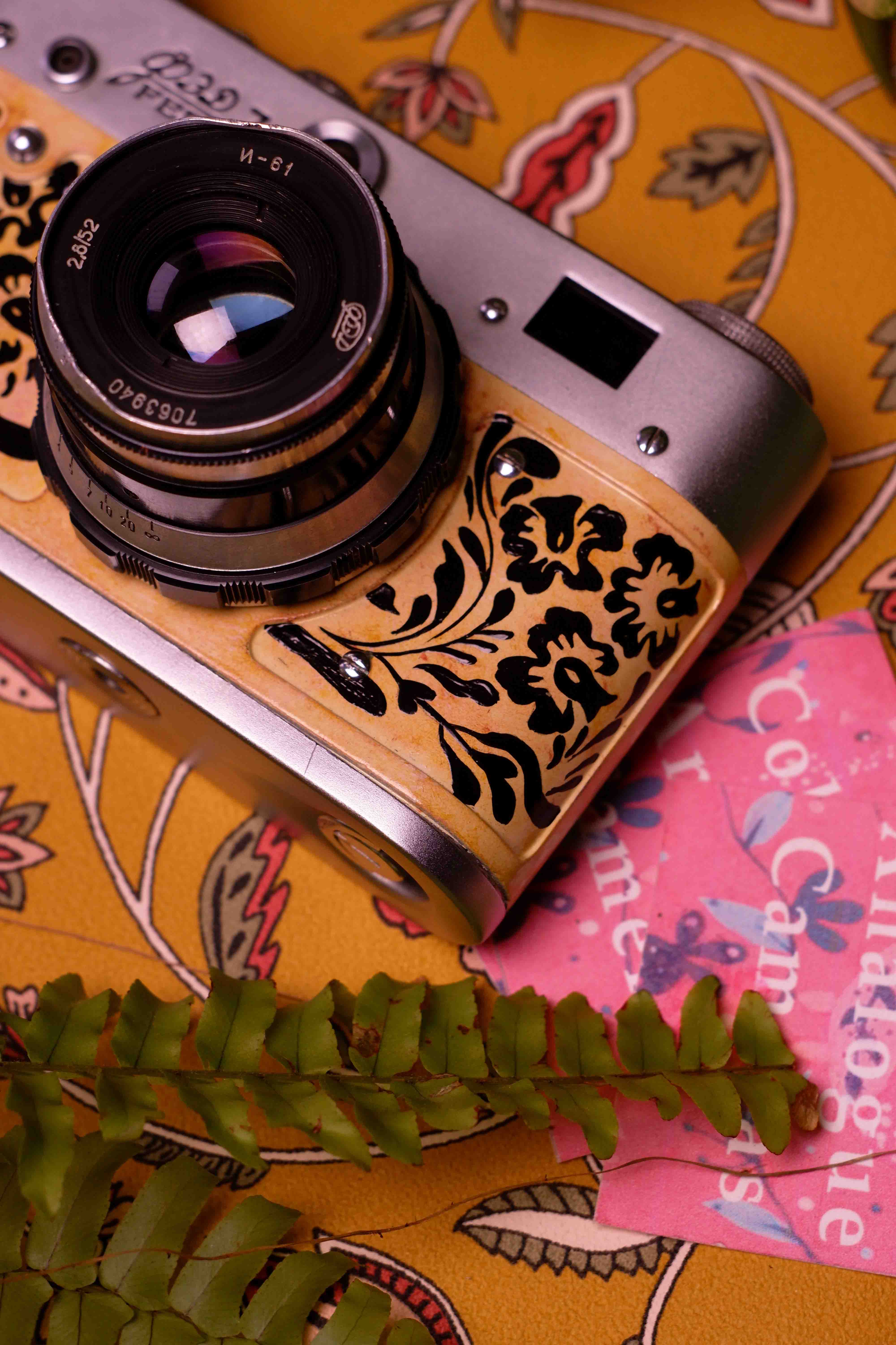 This FED 3 film camera combines classic Soviet engineering with a refined modern aesthetic. Painted in a warm beige tone and decorated with intricate black ornamental details, it transforms a functional vintage tool into an elegant collector’s piece.