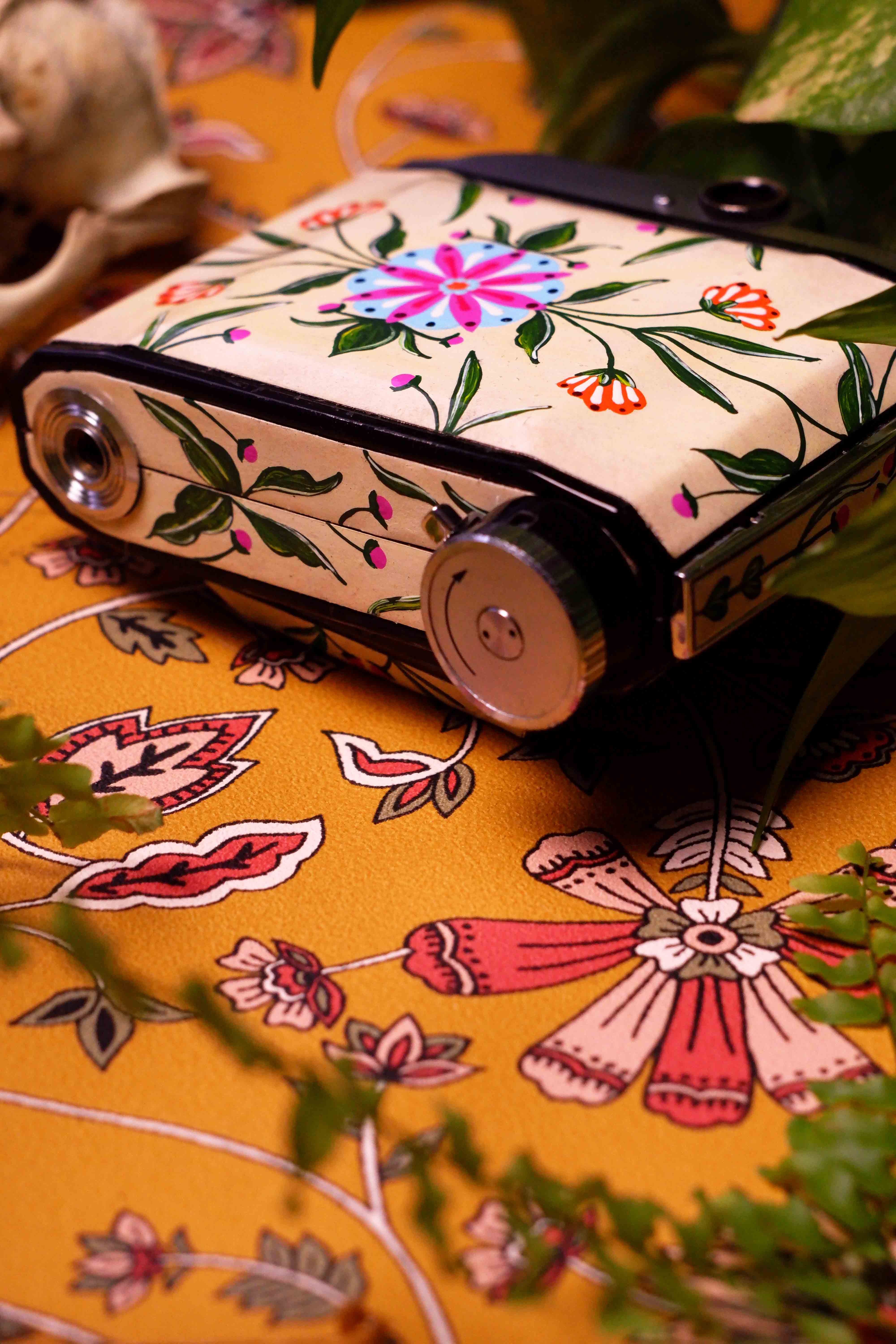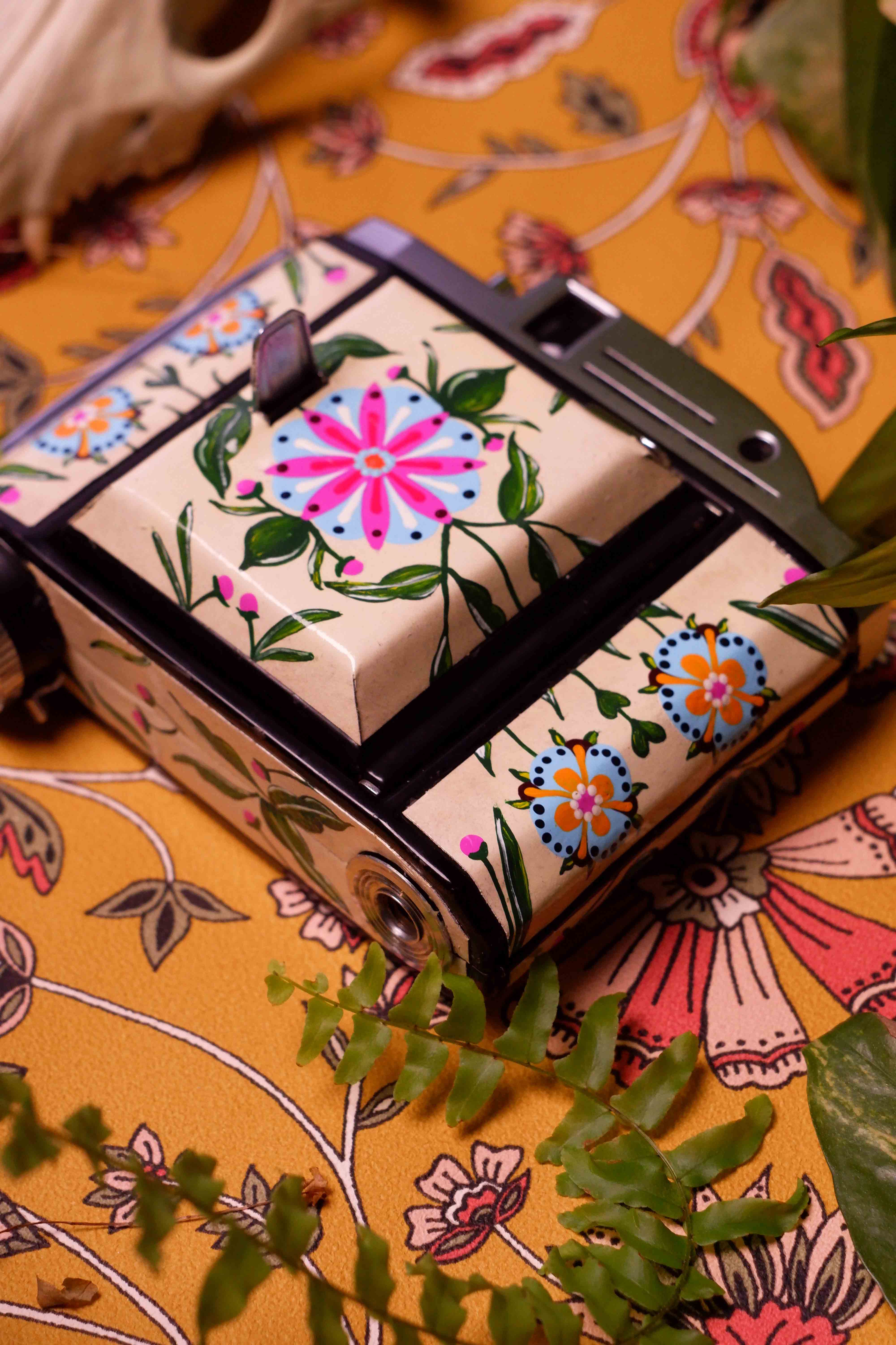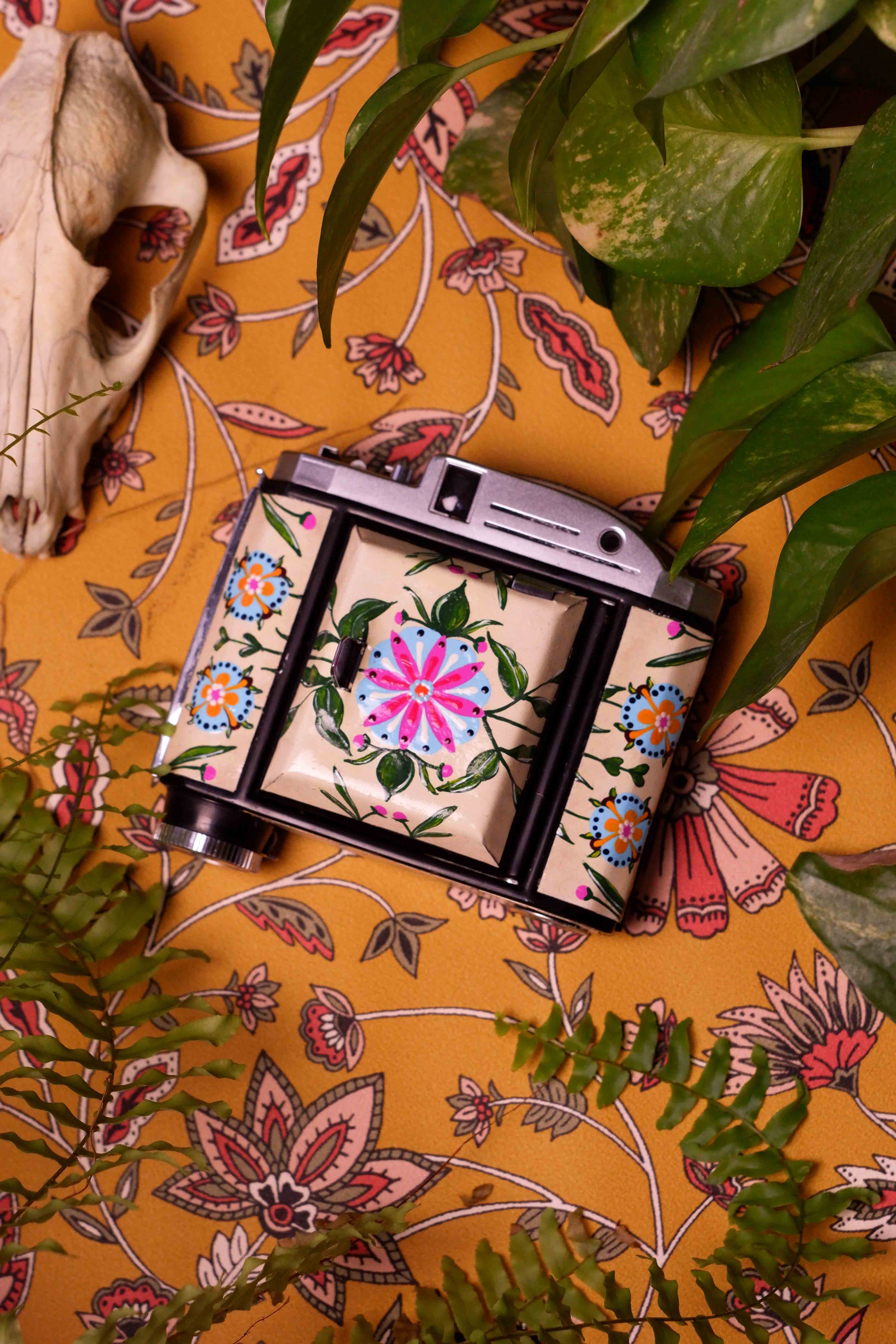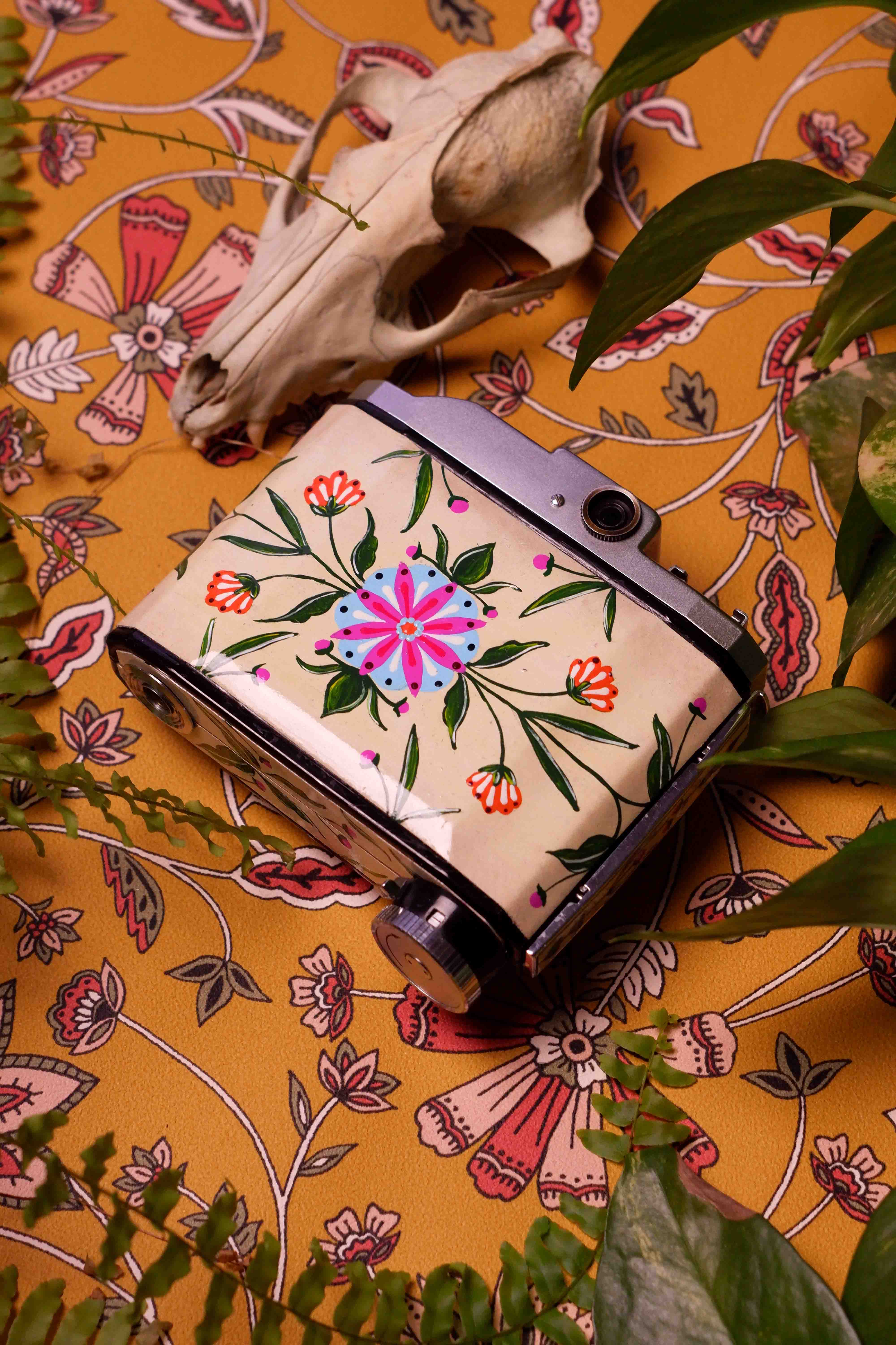 This vintage film camera has been refreshed with custom painted replacement leather, giving it a unique visual character while preserving its classic form. The leather covering was carefully prepared, painted, and sealed to create a durable yet expressive finish that stands out while respecting the camera’s original design.