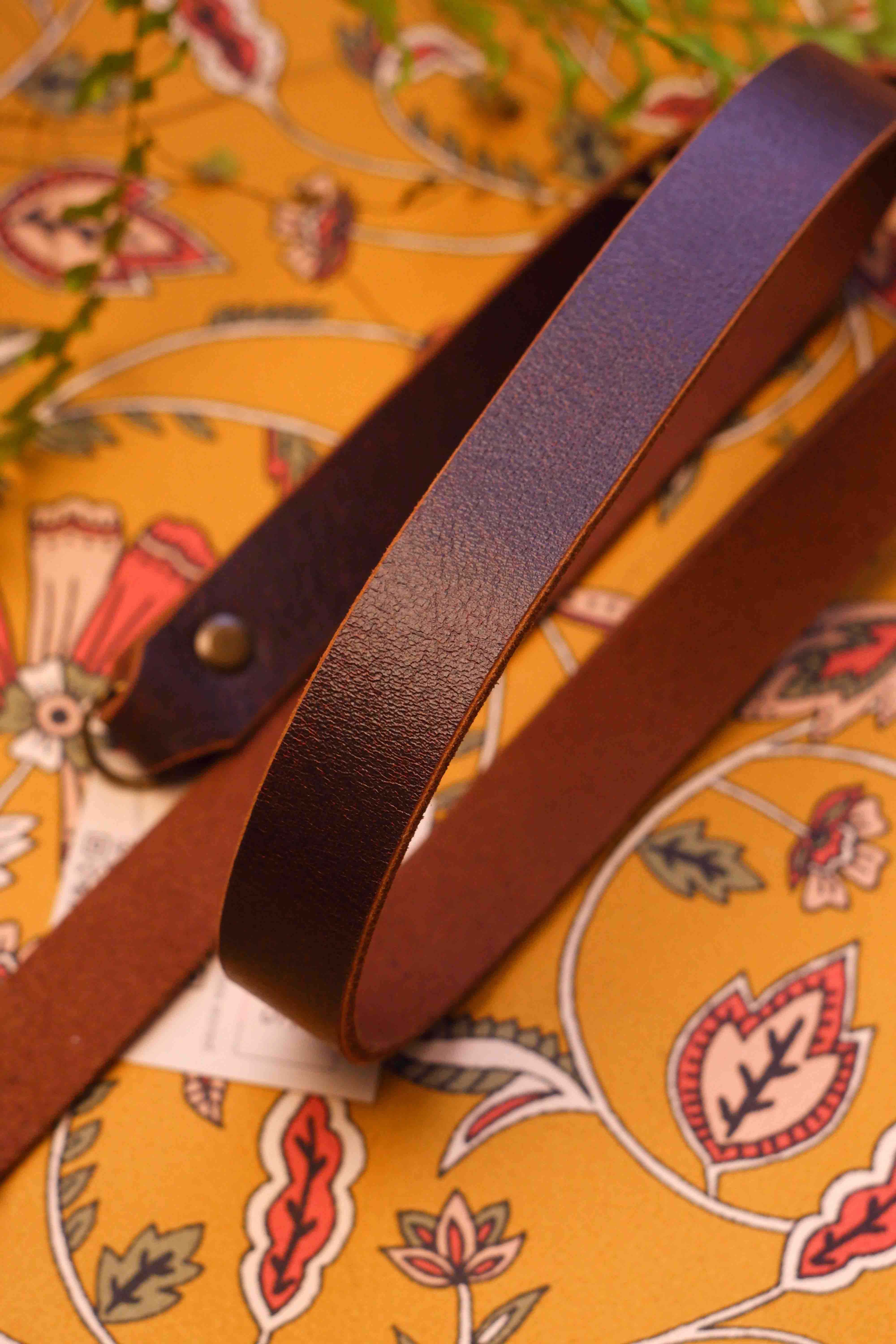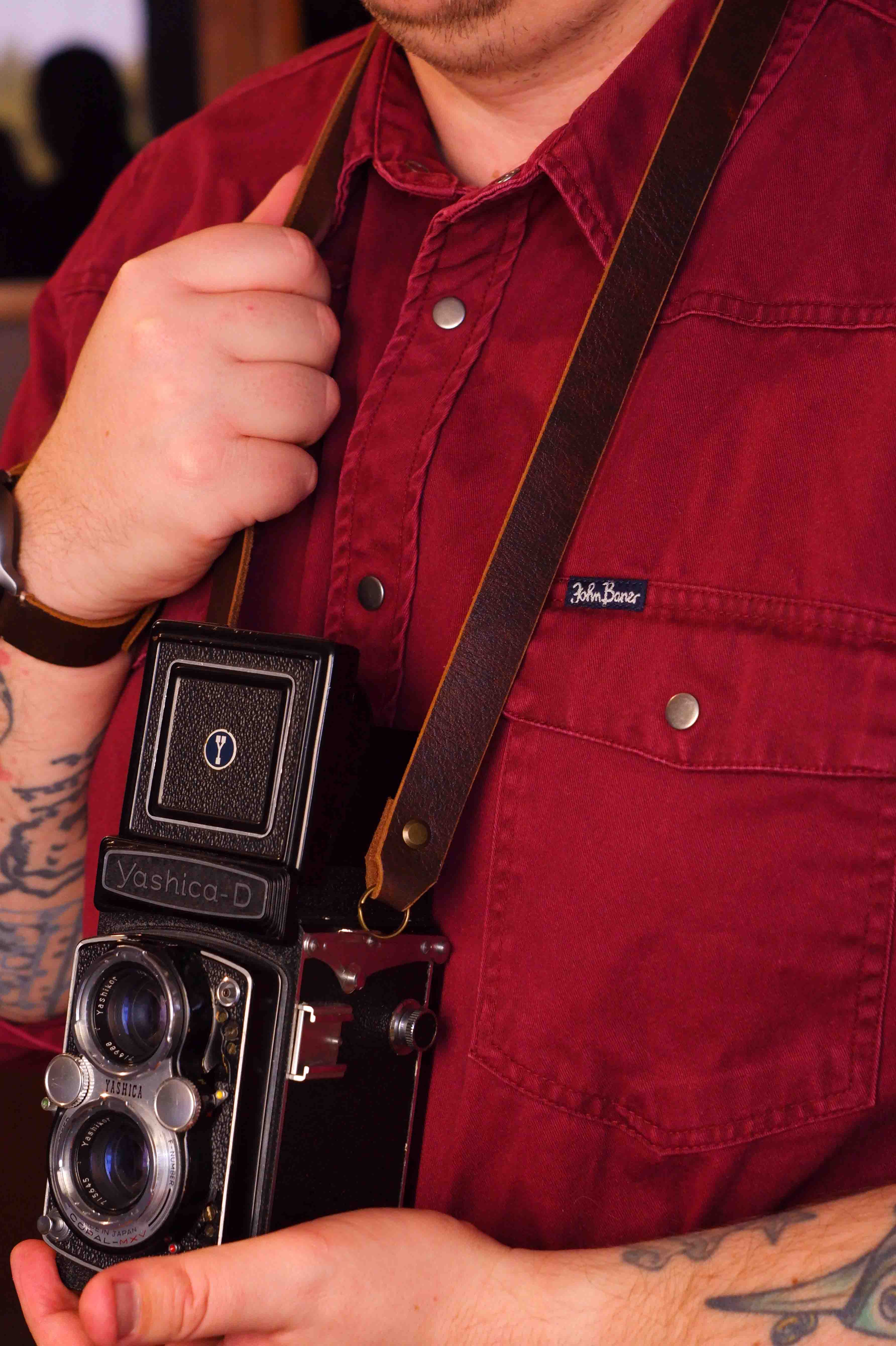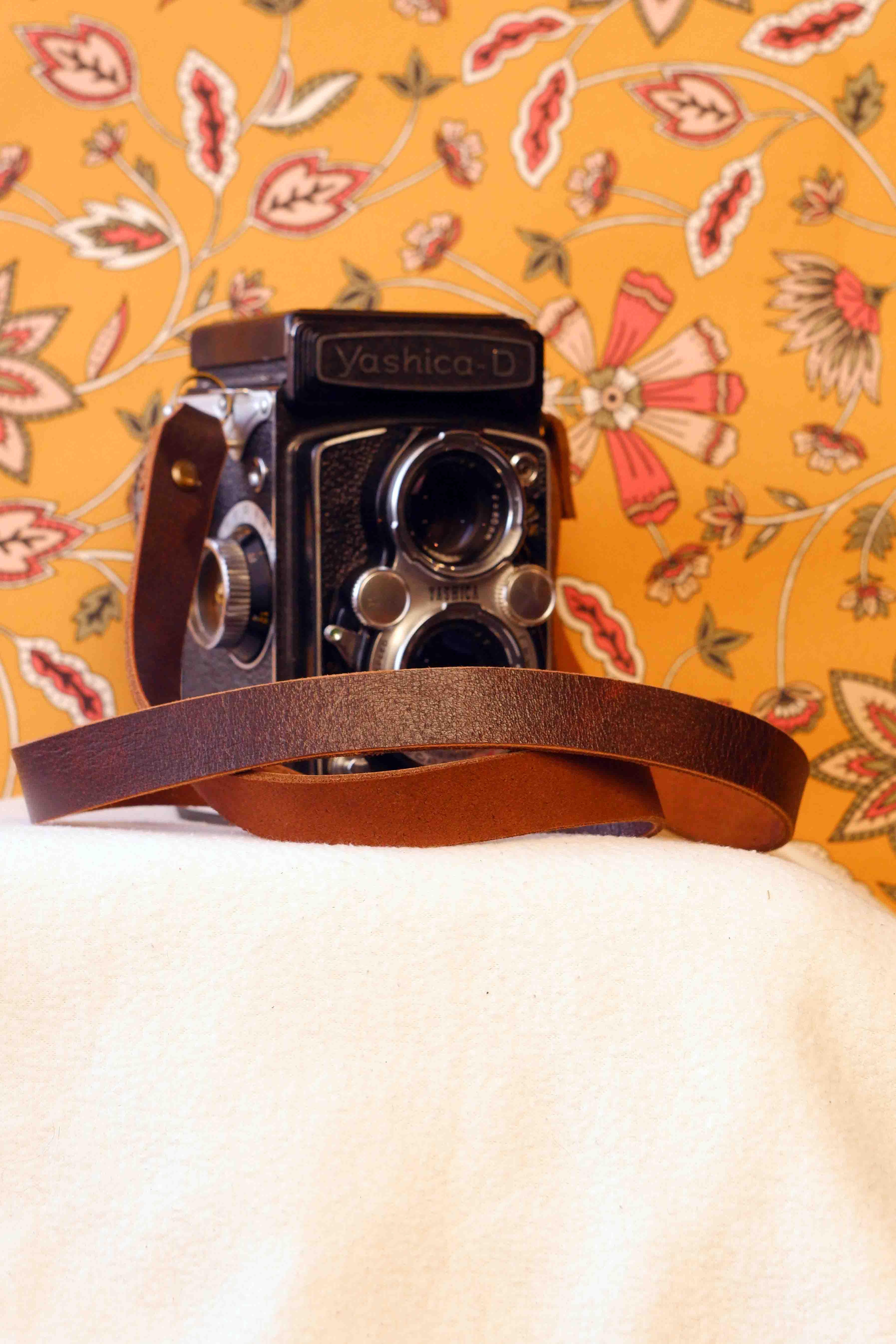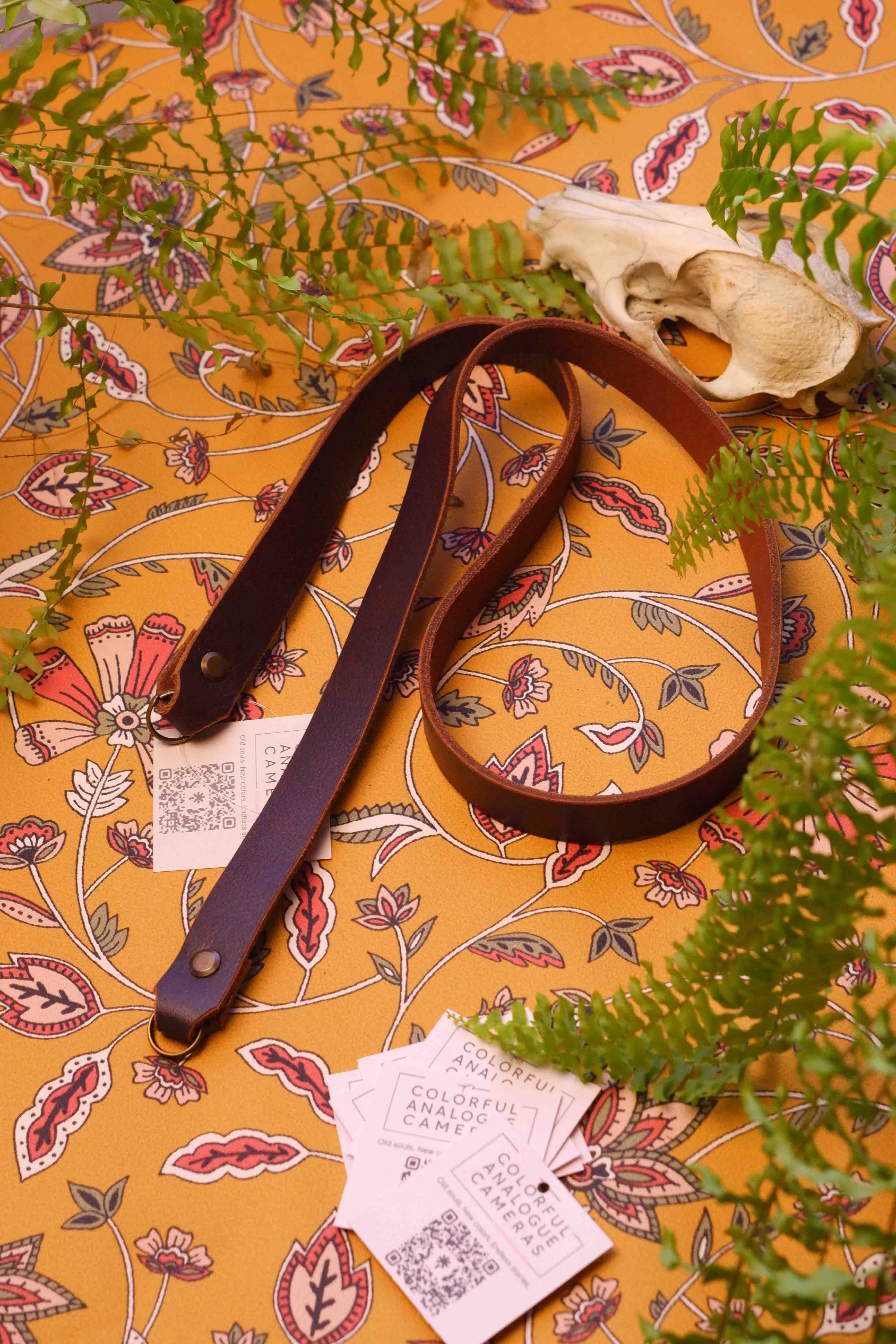 Handmade narrow leather camera strap designed for a clean, lightweight feel and everyday use.