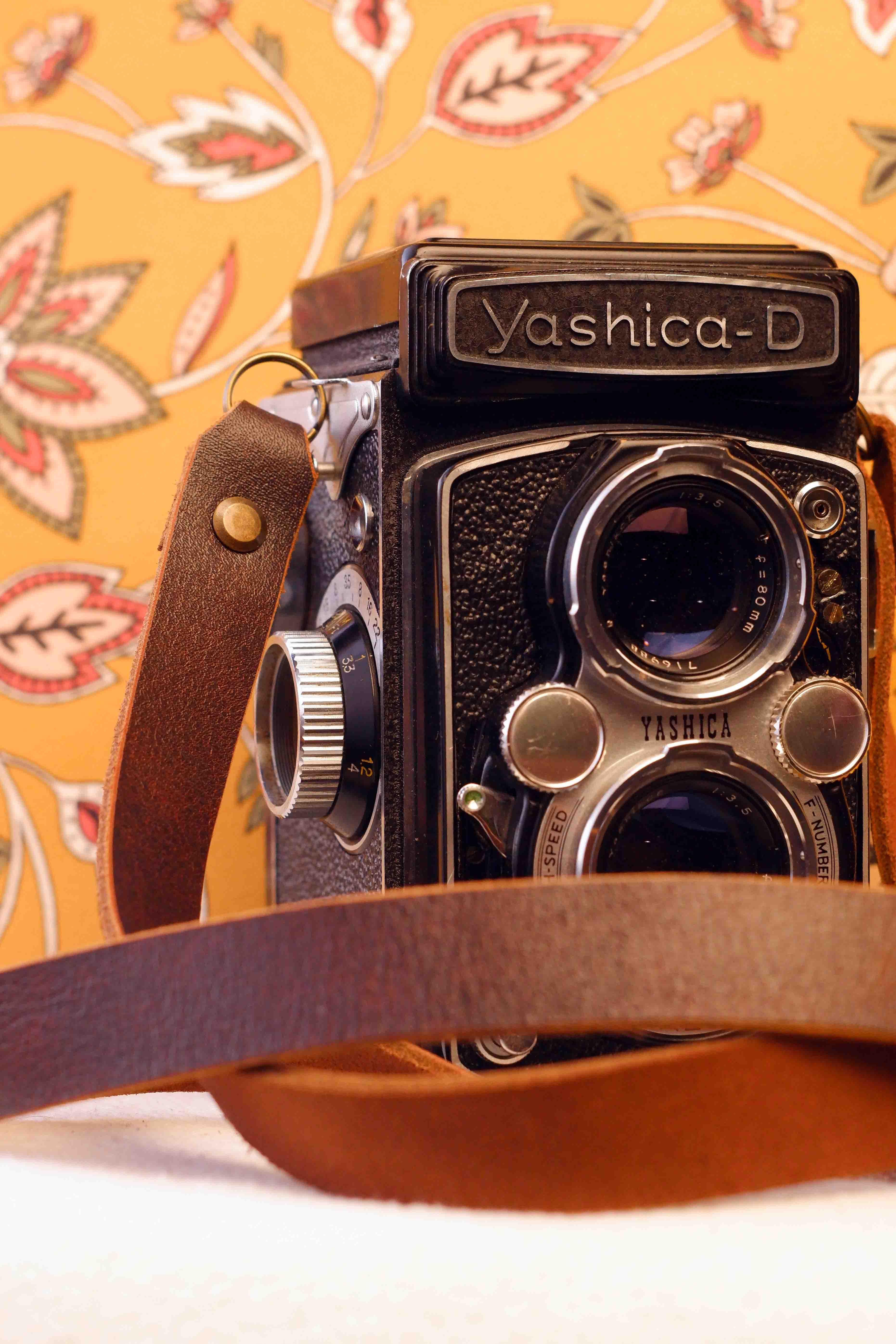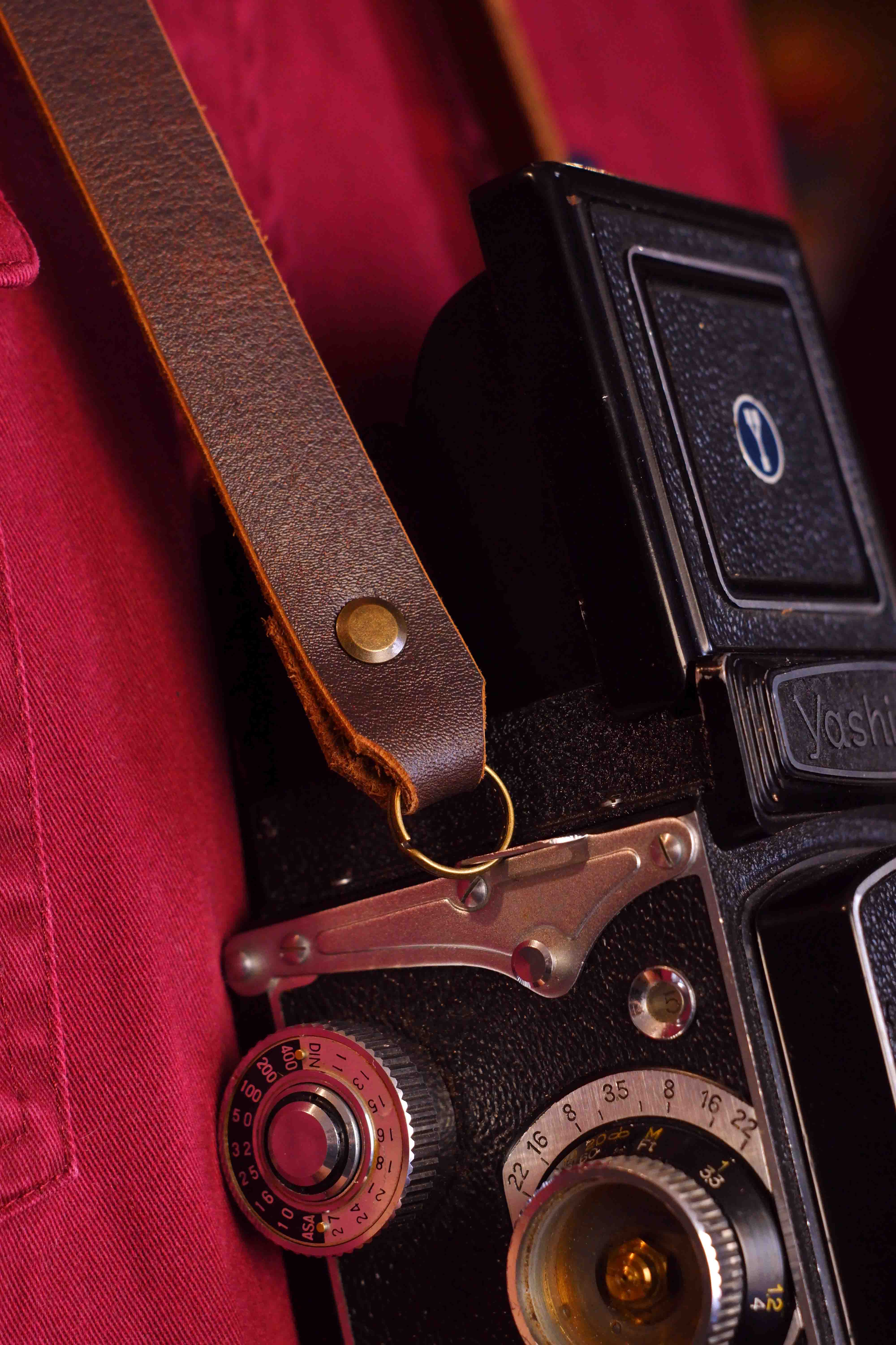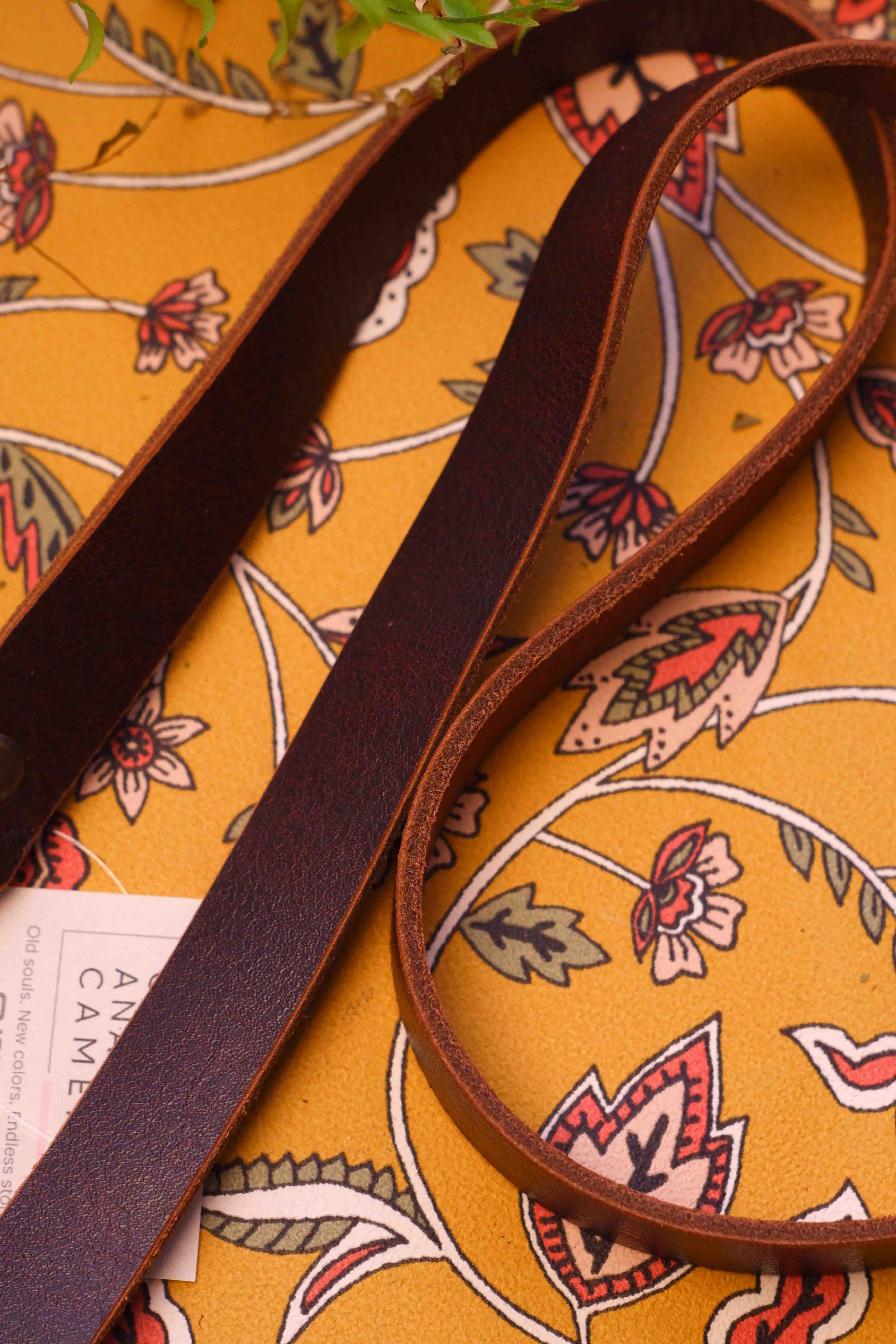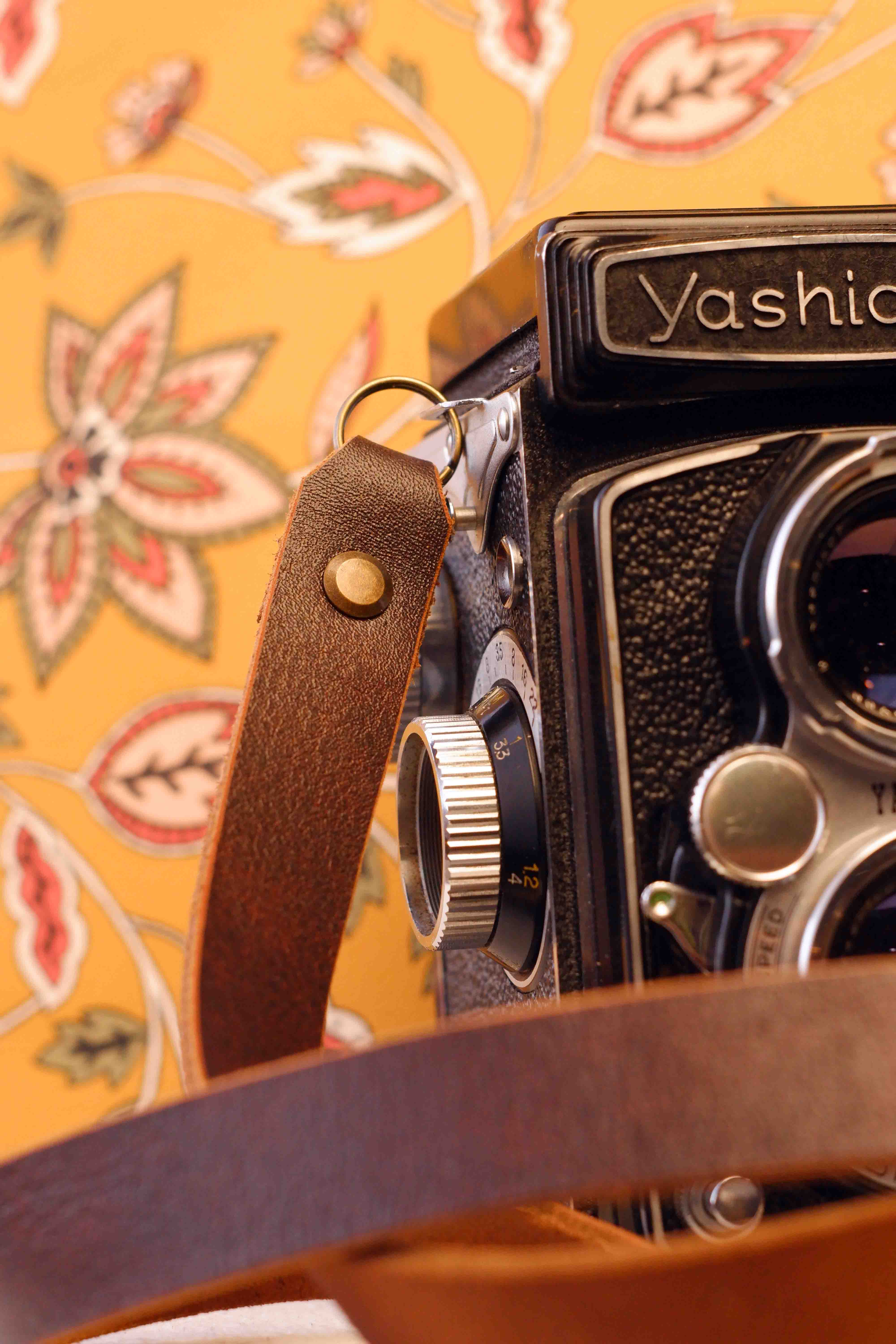 Handmade narrow leather camera strap designed for a clean, lightweight feel and everyday use.